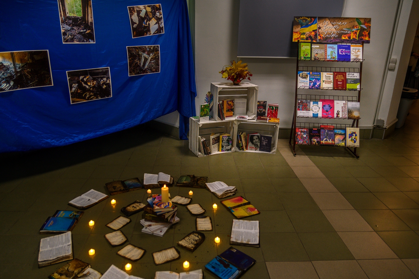 For the Day of Ukrainian Literacy, the SumDU Library prepared a symbolic exhibition “From the Ashes a Word Grows Again”. Part of the library collection was damaged during the recent shelling, but surviving books became a symbol of the Ukrainian word invincibility.