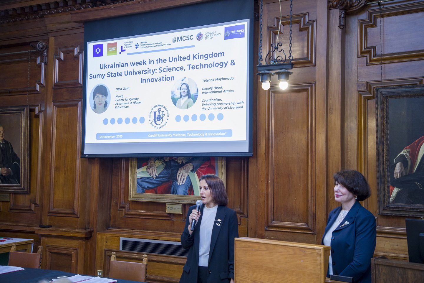 On 12 November, SumDU, as part of the Ukrainian delegation, participated in the event “Science, Technology and Innovation” hosted at Cardiff University (Wales). During the sessions, SumDU representatives Tetyana MAYBORODA, Deputy Head of the International Relations Office, and Olga LYUTA, Head of the Centre for Quality Assurance in Higher Education presented the university’s scientific potential and innovative research areas. They shared SumDU’s experience in implementing innovations and ensuring institutional resilience during wartime in a frontline region, and showcased research results in turbomachinery engineering and nanomaterials. The delegation also held discussions with Cardiff University colleagues on potential areas for future cooperation.