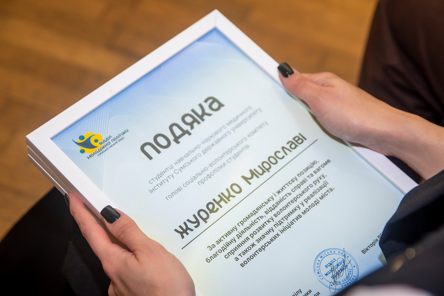 Myroslava ZHURENKO, Anna KOBYLETSKA and Sofiia KARPENIUK (SumDU trade union representatives) were awarded with appreciation from the youth policy department.