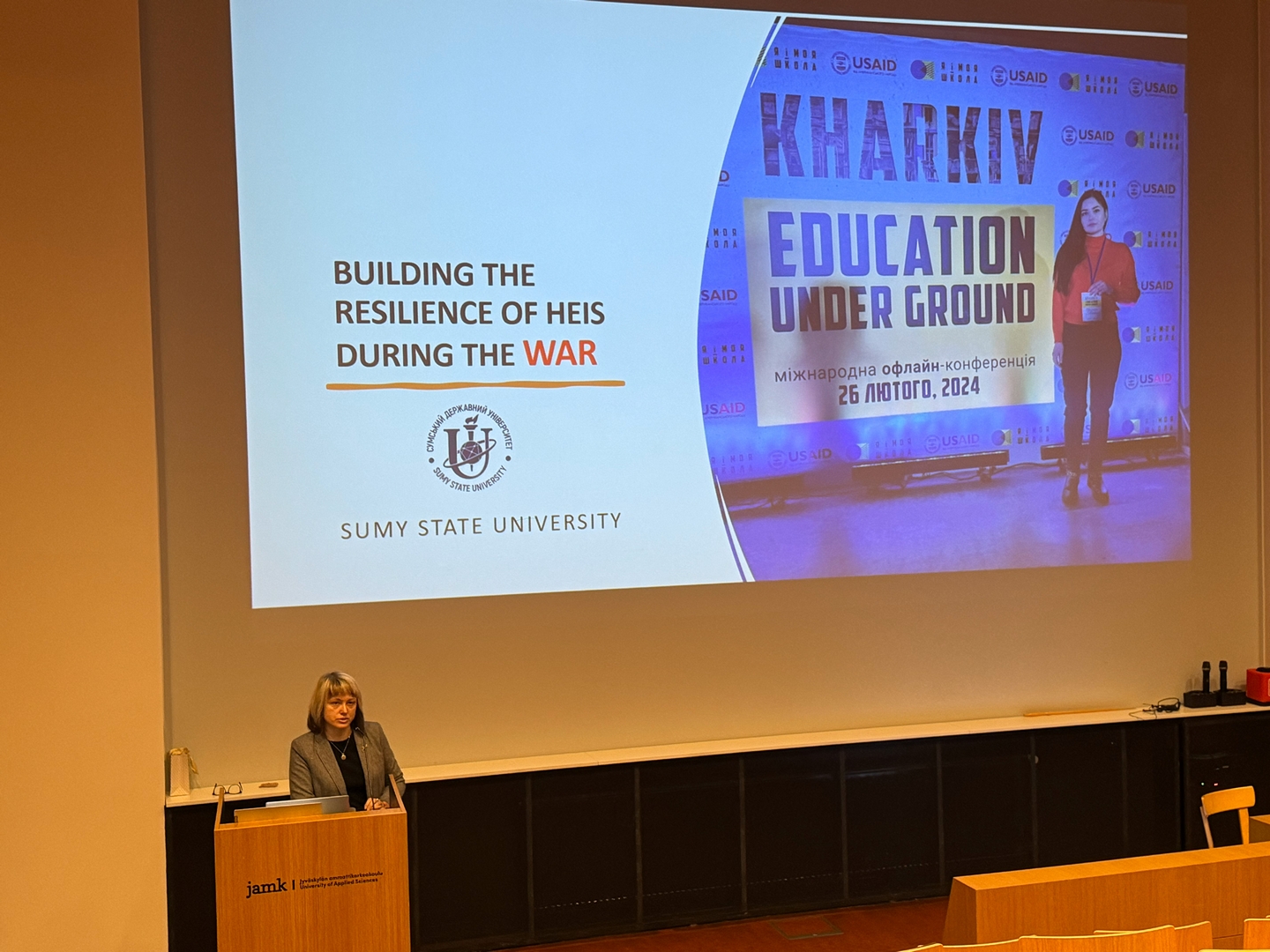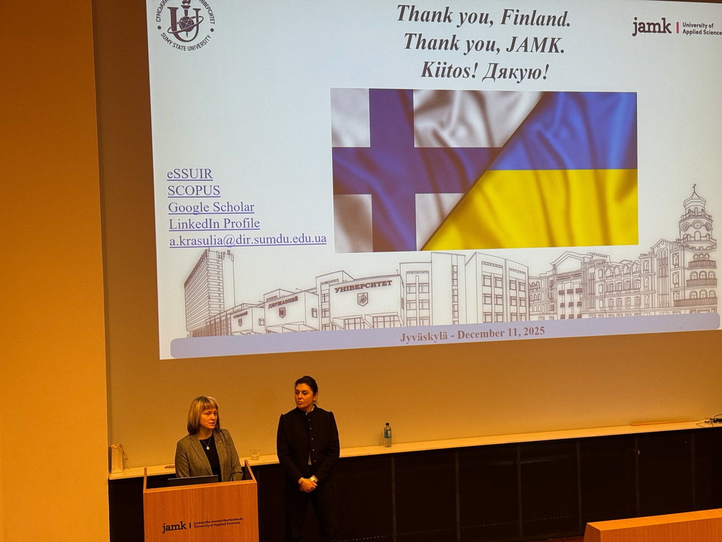 When I looked into the audience, I saw not just interest, but genuine empathy. This was especially palpable from the leadership of Jyväskylä University of Applied Sciences (JAMK). The Rector, Vesa Saarikoski, demonstrated a deep and accurate understanding of the context of russia’s war against Ukraine – without simplifications or illusions. At that moment, I felt that our views and educational philosophies truly aligned: education is not a service or a formality, but a responsibility, a form of resistance, and a care for the future. For me, it was a quiet yet very powerful realization that the story of a Ukrainian university living next to war is being heard and understood – and that this story is not only about pain, but also about dignity, resilience, and the ability to remain human even when the world around loses its balance.”