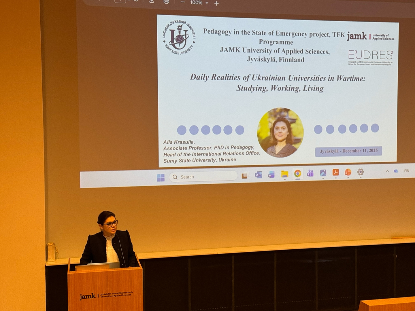 “I deliberately structured my presentation as a story – not as a set of facts or statistics, but as a narrative about a living organism, which our university has become today. A university that lives, breathes, and teaches just 30 kilometres from the enemy. I wanted this to be a story not only about education during war, but about a community of people who wake up every morning not asking ‘Will there be a class today?’, but ‘Will it be safe?’ – and who nevertheless continue teaching, publishing research, supporting students, and building the future.