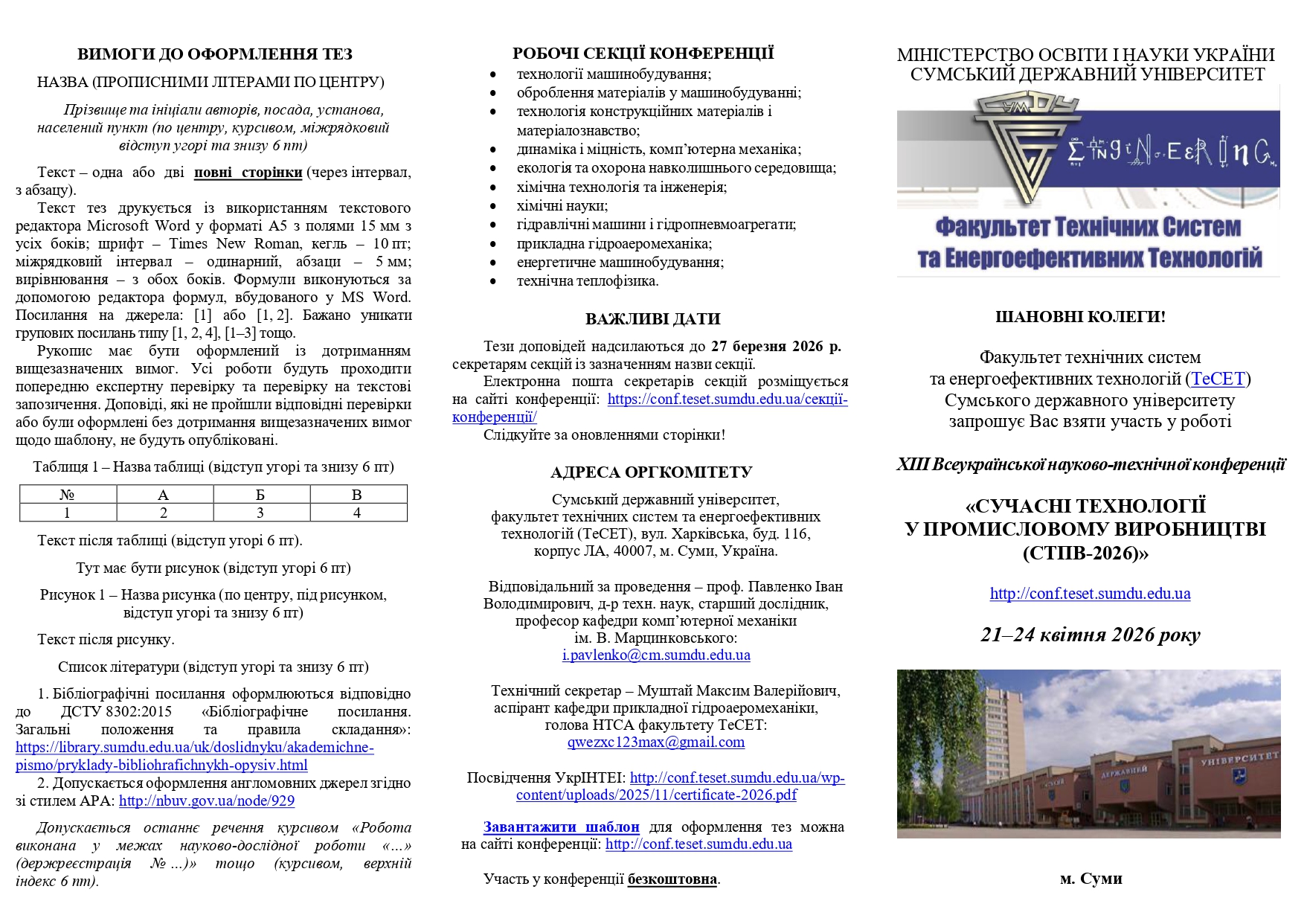 Місце проведення: м. Суми, Сумський державний університет (факультет технічних систем та енергоефективних технологій).