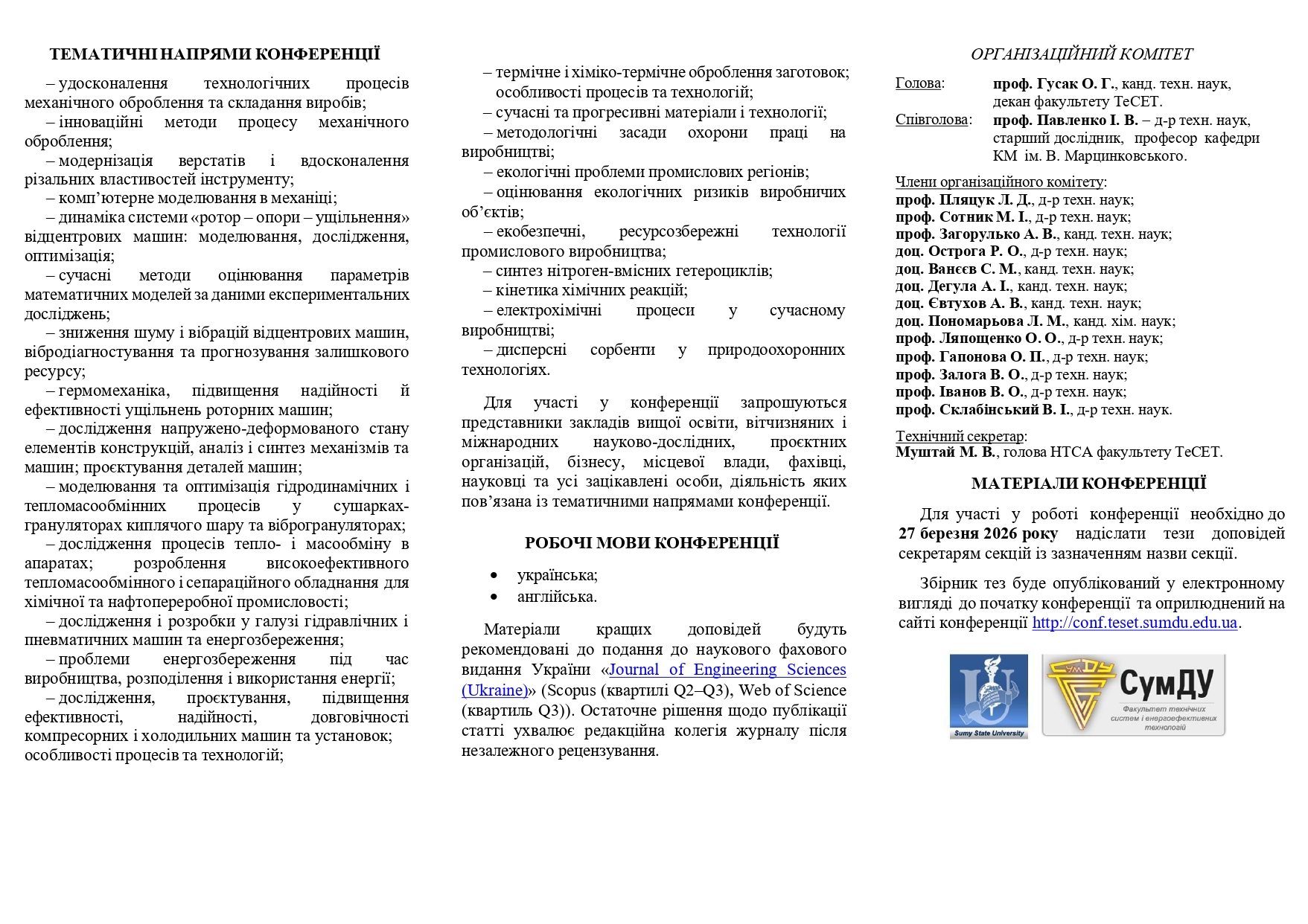 Сумського державного університету запрошує до участі представників закладів вищої освіти, науково-дослідних установ, проєктних організацій, промислових підприємств, місцевої влади та всіх зацікавлених у тематичних напрямах конференції.